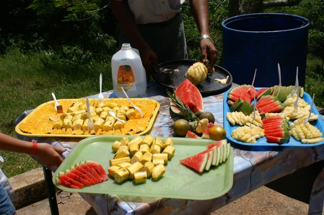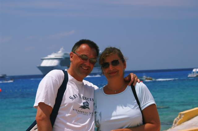Nach einiger Zeit des Wartens, wurden auch wir aufgerufen, uns auf unser Ausflugsboot zu begeben. Ca. 1 Std. fuhr es an der Küste von Cozumel vorbei, wo man noch die Auswirkungen des Hurrikans sehen konnte – entwurzelte Bäume, defekte Häuser. Lt. Tourbegleiter sollen hier auf den Strand 12 – 15 Meter hohe Wellen hereingebrochen sein, und der Hurrikan 32 Stunden gewütet haben. Am Riff angekommen, bekam jeder eine Schwimmweste, Brille und Schnorchel, sowie Flossen und wir konnten 1 Stunde lang am Riff schnorcheln. Auch hier war durch den Hurrikan einiges in Mitleidenschaft gezogen, so dass man leider nicht viele Fische sehen konnte. Die Rückfahrt verlief feucht-fröhlich, bei Bier, Punsch und Tequila. Achim und ich haben diesem gut zugesprochen und die Sonne und das fehlende Mittagessen tat das übrige, dass wir uns hinterher ein wenig angeschwipst gefühlt haben. |