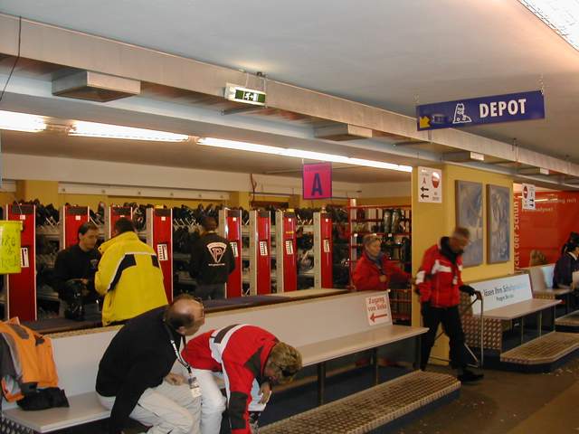 machen konnten. Da wir an der Komperdell Talstation unsere Ski und Schuh im Depot abgeben wollten, mussten wir uns mit all diesen Sachen in die Dorfbahn quetschen. Überlebt, ebenso das Depot, wo es stank wie in einem Puma-Käfig – kein Wunder bei den Massen an Skischuhen /Schuhen, die so richtig ausdünsteten.